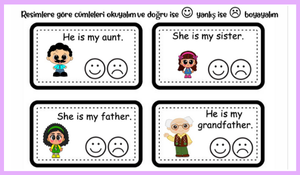 Öğrenciler, görseller yardımıyla aile bireylerinin İngilizce isimlerini yazma ve verilen cümlelerin doğruluğunu değerlendirme etkinlikleri yaparlar.