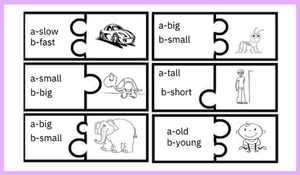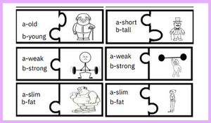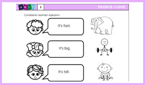 İlk bölümde öğrencilerden, verilen sıfatları uygun resimlerle eşleştirmeleri istenir (örneğin: tall, small, fast).