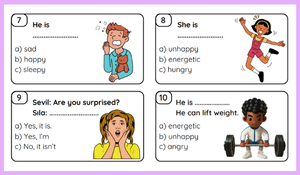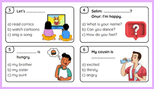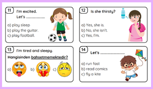 Görsellerle desteklenen çoktan seçmeli sorularla, öğrencilerin hem görsel hem de dil becerilerini geliştirmeleri hedeflenmiştir.