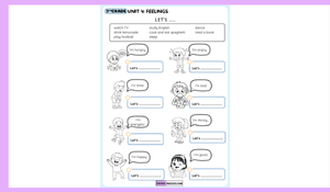 3. sınıf İngilizce Feelings ünitesi için hazırladığımız öğrencilerin duygu ifadelerini günlük eylemlerle ilişkilendirmesini hedefleyen kapsamlı bir worksheet sizlerle. Öğrencilerin fiilleri doğru görsellerle eşleştirmeleri ve “Let’s …” kalıbını cümle tamamlama etkinlikleri sayesinde happy, angry, tired, hungry, thirsty gibi temel duygu ifadeleri ile birlikte kullanmaları hedeflenmiştir.