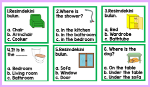 Öğrenciler ev bölümleri, ev eşyaları ve konum belirten ifadelerle ilgili çoktan seçmeli sorularla bilgilerini pekiştirir.