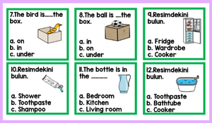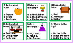 “Where is the…?”, “What is this?” gibi temel soru kalıplarının yanı sıra şekil ve yer yön kavramları da test edilmektedir.