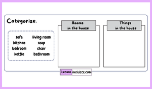 3. Sınıf İngilizce dersi 6. Ünite “My House” kazanımlarını desteklemek amacıyla hazırladığımız bu çalışma, öğrencilerin evdeki odaları (rooms) ve ev eşyalarını (things in the house) tanımalarını, kelime bilgisini geliştirmelerini ve bu kavramları doğru şekilde eşleştirme (match) ve sınıflandırma (categorize) yoluyla pekiştirmelerini hedefler.