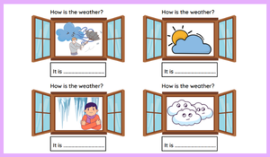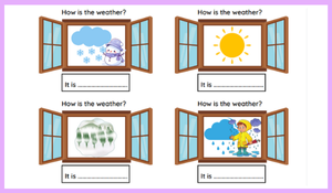 Öğrencilerin “How is the weather?” sorusunu tekrar etmeleri ve cevaplamaları için yapılandırılmış sade ve tekrar odaklı bir etkinlik sunar.