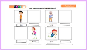3.Sınıf People I love Ünitesi içerisinde geçen zıt anlamlı sıfatlar ile ilgili kes yapıştır etkinliği hazırlanmıştır. Sıfatlar görsel olarak desteklenmiştir. Öğrenciler eğlenceli bir şekilde kes yapıştır etkinliğiyle sıfatları tekrar edebilirler.
