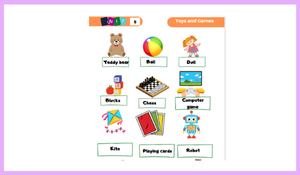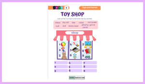 3.Sınıf 5.ünite Toys and Games ünite kelimeleri görsellerle akılda kalıcı şekilde verilmiştir. 2.sayfada toyshop etkinliği ile öğrendikleri kelimeleri pekiştirme amaçlanmıştır.