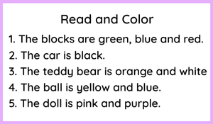 🎨 Öğrencilerden, verilen yönergelerle oyuncakları doğru renklere boyamaları beklenir (örneğin, "The car is black.").