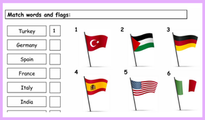 Öğrenciler, ülke isimlerini doğru bayraklarla eşleştirerek temel ünite bilgilerini pekiştirirler.