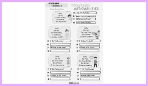 4. Sınıf İngilizce Dersi 2. Tema (Theme 2) olan Countries & Nationalities (Ülkeler ve Milliyetler) konusunu pekiştirmek için harika bir diyalog tamamlama materyali!