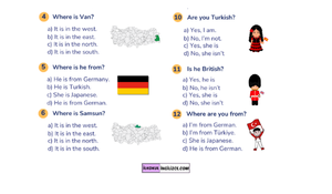 Merhaba 4. Sınıflar! 👋 İngilizce 2. Tema (Countries - Nationalities) için hazırlanan bu çalışma kağıdı, hem nereli olduğumuzu soran kalıpları hem de Türkiye'deki şehirlerin konumlarını test ediyor!