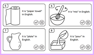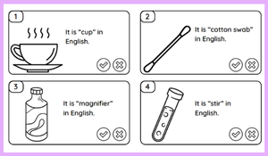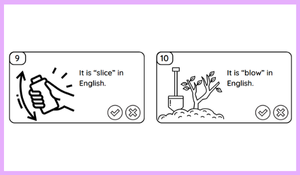 Uygulama aşamasında öğrenciler resimlere bakarak verilen İngilizce kelimenin doğru olup olmadığını işaretler, böylece dikkat, görsel okuma ve kelime eşleştirme becerileri gelişir.