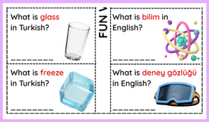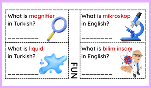 “Fun with Science” temalı bu bölümde, İngilizce ve Türkçe kelimeler arasında eşleştirme yapmaya yönelik sorular yer almaktadır.
