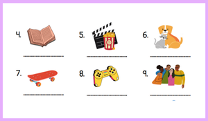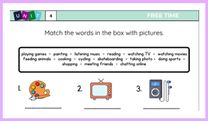 Öğrenciler, verilen kelimeleri resimlerle eşleştirerek hem kelime dağarcıklarını geliştirir hem de boş zaman aktivitelerini pekiştirir.