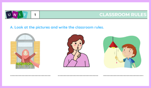 Dosya, öğrencilerin sınıf kurallarını tanımalarını ve ilgili görsellere bakarak kuralları yazmalarını amaçlamaktadır.