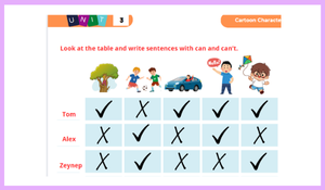 4.Sınıf 3.Ünite Chartoon Characters Can / Can't yazma etkinliğimiz öğrencilerin cümle kurma becerilerini geliştirip can ve can't konusunu tekrar etmelerini sağlamak amacıyla hazırlanmıştır.