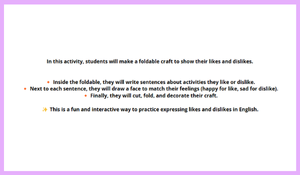 Bu etkinlik, öğrencilerin İngilizce'de sevdiği ve sevmediği şeyleri ifade etmesini eğlenceli ve etkileşimli bir şekilde destekler.