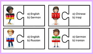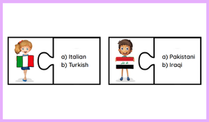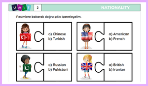 Öğrenciler, her soru için verilen iki seçenekten resimle en uyumlu olan milliyeti işaretleyerek konuyu eğlenceli ve kalıcı şekilde öğrenirler.