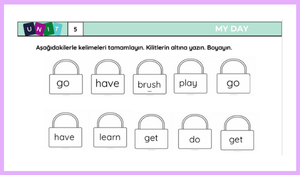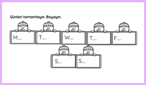 Öğrenciler, kelime tamamlama, günlerin isimlerini yazma ve sayıları İngilizce olarak yazma gibi etkinliklerle konuyu pekiştirir.