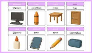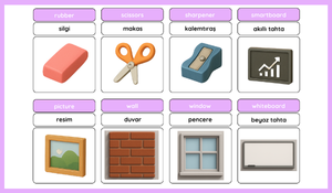 Classroom Objects (Sınıf Eşyaları): 🪑 chair, 🖊️ pencil, 🖍️ crayon, 📚 book, 🖥️ computer, 🕰️ clock, 📦 box, 🚪 door, 📖 notebook, ✂️ scissors, 🧽 rubber (silgi), 🖌️ glue, 📐 sharpener, 🖼️ picture, 🧑🏫 board, 🪟 window, 🧾 whiteboard, 📚 bookcase vb.