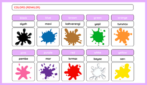 Colors (Renkler): 🎨 black, blue, green, yellow, pink, purple, red, orange, brown, white.