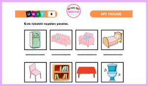 Öğrenciler, evin bölümlerini ve içindeki eşyaları İngilizce olarak yazma alıştırmaları yaparak kelime bilgisini pekiştirir.