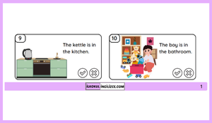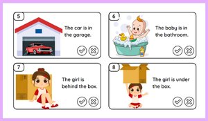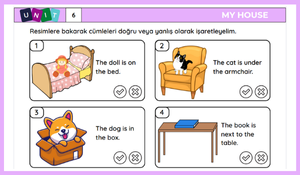 Öğrenciler, verilen cümleleri resimlerle karşılaştırarak "Doğru" veya "Yanlış" olarak işaretler, böylece hem görsel okuma becerileri gelişir hem de mekânsal yer bildiren kalıpları pekiştirir.