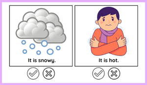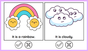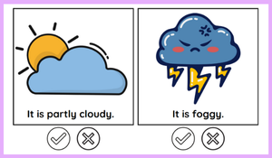 Öğrenciler, verilen hava durumu ifadelerinin doğru veya yanlış olduğuna karar verip boyama yaparak hem İngilizce kelimeleri pekiştirir hem de görsel yönden keyifli bir etkinlik gerçekleştirir. 🎨
